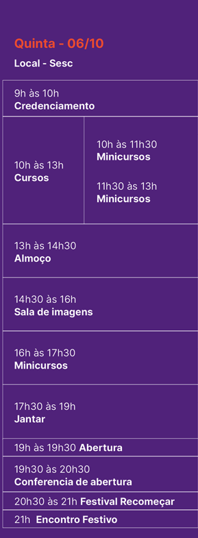 Ementa: Este curso convida ao diálogo e a discussão sobre a presença das expressões das culturas populares brasileiras nos processos criativos em Ginástica para Todos. Qual tem sido a contribuição da GPT para a valorização destas expressões? Há uma preocupação com as comunidades detentoras destes conhecimentos? Os processos criativos têm priorizado um estudo profundo destas expressões ou só produzido mais uma apresentação “para turista ver”? Iremos abordar a perspectiva colonizadora presente na GPT em relação às culturas populares e buscaremos apresentar caminhos para possíveis ressignificações.