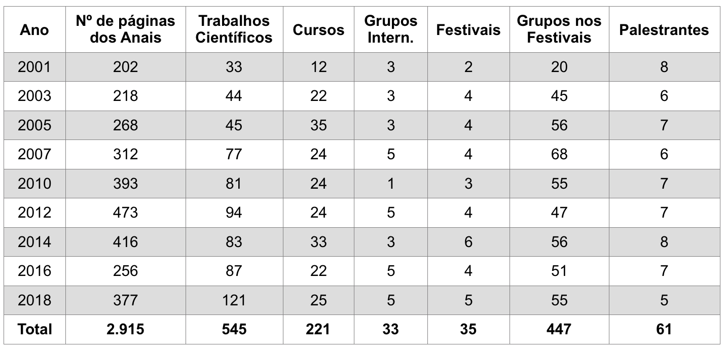 Ao longo destes anos a programação do evento vem sendo modificada, com uma variedade de sessões e atividades, geralmente composta por conferências, mesas temáticas, apresentações de trabalhos científicos e relatos de experiências, cursos, oficinas, festivais, encontros de coletivos e lançamentos de livros, com a participação de pesquisadores(as), professores(as), estudantes e grupos convidados, nacionais e internacionais.